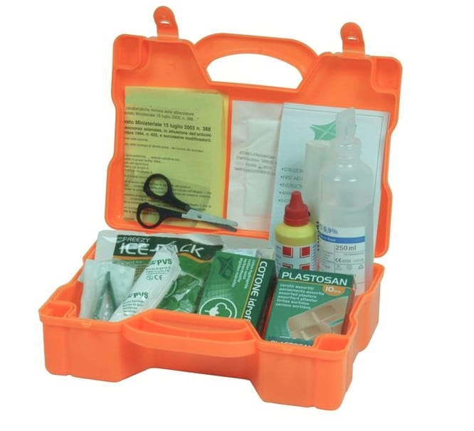 PVC, color naranjaPara empresas de hasta 2 personasTapices de paredCONTIENE:1x frasco de povidona yopovidona ml. 1252x pares de guantes estériles1x solución salina ml. 2501x bolsa de gasa hidrofílica estéril cm 18×403x Bolsa de gasa hidrofílica estéril 10×10 cm1x pinzas estériles1x paquete de algodón1x caja de 10 tiritas surtidas1x bobina de yeso m. 5×2,5 cm1x Vendaje de gasa hidrofílica1x par de tijeras1x Torniquete1x Bolsa de hielo instantánea1x Bolsa de residuos médicos